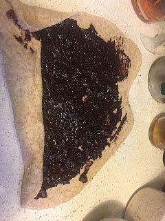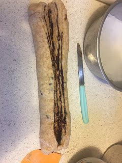 Stendi l'impasto in una forma rettangolare. Distribuisci uniformemente il ripieno sulla superficie. Opzionalmente, aggiungi dell'uvetta.