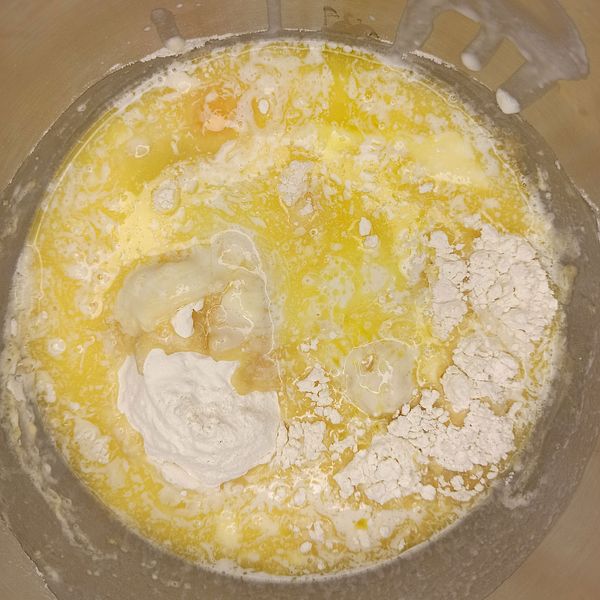 Transfer the starter mixture into a large bowl, then add all the ingredients for the bread dough into the bowl. Knead vigorously for about 15-20 minutes until the dough becomes elastic and doesn't stick to the bowl.