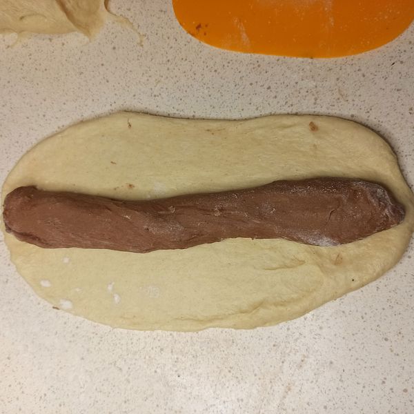 Roll the white dough portions into balls. Take a brown dough portion and roll it into a long strip. Place the brown strip on top of the white dough and wrap the white dough around it, completely sealing the edges like in the video. Repeat for all the portions.