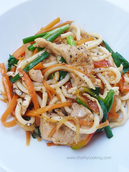 Nêm nước tương, dầu hào, muối. Xào đều tay tới khi thịt và rau củ vừa chín tới là cho phần Udon đã ráo nước vào, xới cho thấm đều gia vị