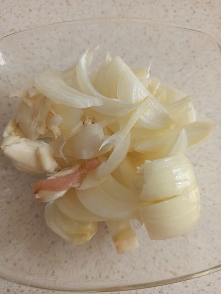 Bắc chảo lên bếp, cho hành tây múi cau và tỏi vào xào cho thơm, không cần chín vàng