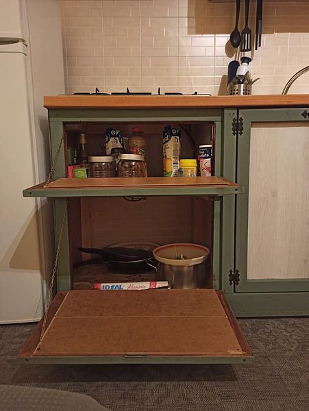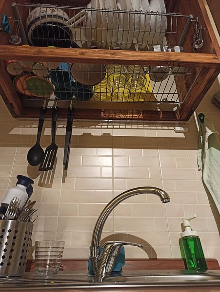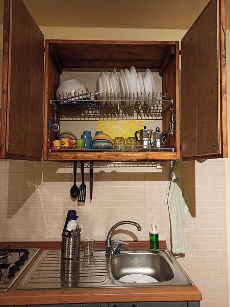 Đây là một căn bếp hết sức cơ bản nhưng hoàn toàn đáp ứng nhu cầu nấu ăn, bao gồm một cái sink để rửa chén, rửa rau, bếp, tủ lạnh, tủ bếp, và chạn làm khô chén, ly tách. Ngoài ra còn có máy hút mùi ngay trên cái lò bếp.