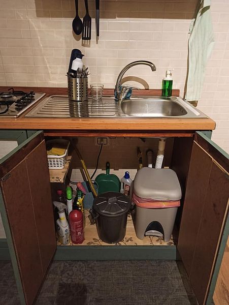 Ngay mé dưới là tủ đựng các loại nước tẩy rửa và các loại rác khác nhau. Châu Âu phân loại rác rất kỹ nhé. 👌👍😁 Mọi người đi du lịch chịu khó giúp chủ nhà phân loại rác, bảo vệ môi trường nha. 👍🌱