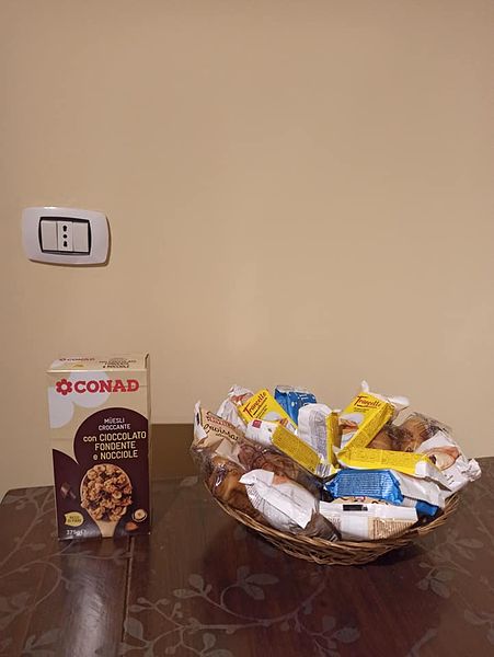 Dưới cái bếp lò là chạn đựng đồ khô, cà phê, trà, v.v. Dưới chạn trà là một chạn khác, đựng nồi niêu cơ bản, giấy bạc. 👍 Bạn chủ nhà quá xuất sắc còn làm 1 chiếc bánh táo cho bọn mình ăn sáng. Còn chuẩn bị một rổ to các loại bánh ngọt để ăn sáng, vì người Ý thường ăn sáng bằng đồ ngọt. Có cả cereal nếu ai muốn ăn. 😁👍👍